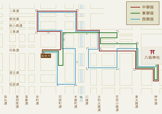 中御座中御座(三若)、東御座(四若)、西御座(錦)と三基の神輿が八坂神社かあっちこっち回って、お旅所に到着します